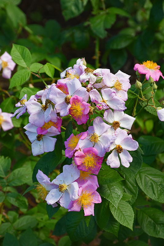Climbing Wild Rose features showy clusters of lightly-scented pink flowers with gold eyes and white centers along the branches from early to mid summer. The flowers are excellent for cutting. It has emerald green deciduous foliage. The oval compound leaves do not develop any appreciable fall color.