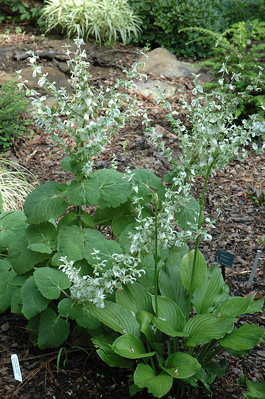 White Clary Sage has masses of beautiful spikes of white flowers with green bracts rising above the foliage from late spring to late summer, which are most effective when planted in groupings. The flowers are excellent for cutting. Its attractive large fragrant oval leaves remain dark green in color throughout the season.