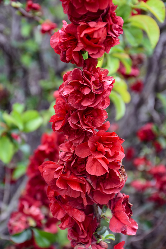 A medium sized shrub covered with lovely scarlet flowers in spring, a profuse bloomer that is thornless and does not produce fruit; a single-season showstopper adding vivid color in spring; prune to maintain shape