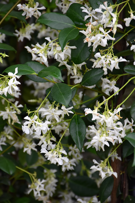 Confederate Star-Jasmine features tiny fragrant white tubular flowers along the branches from late spring to early summer. It has dark green evergreen foliage which emerges light green in spring. The glossy pointy leaves remain dark green throughout the winter.