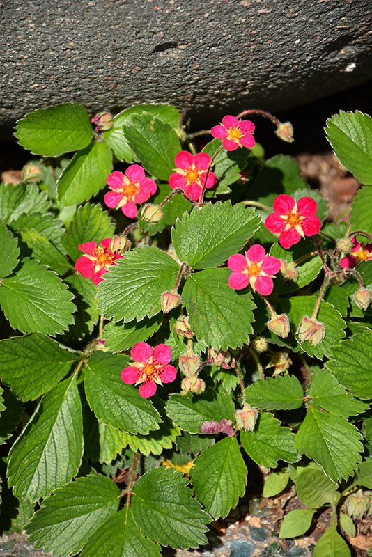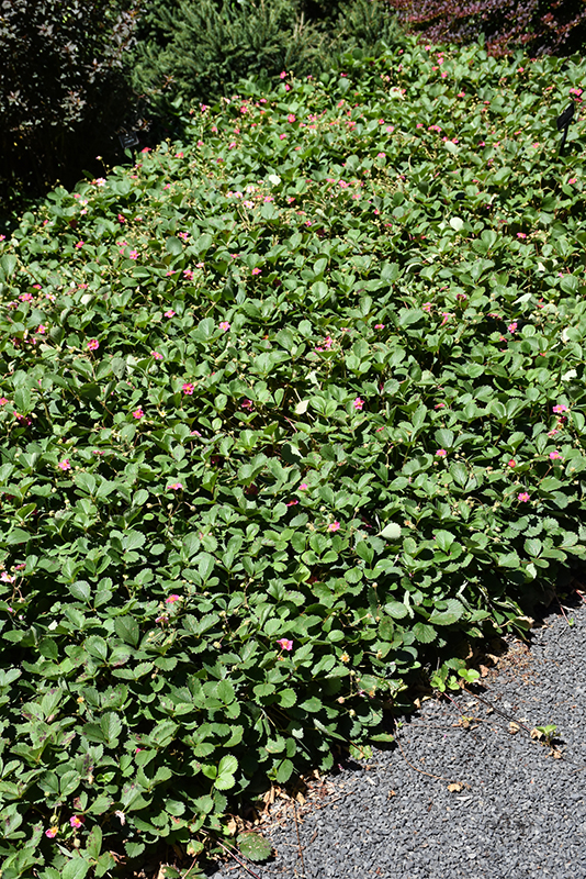 An ornamental strawberry perfect for containers, hanging baskets, window boxes or used as groundcover; bright cherry-red flowers are nestled on top of mounded green foliage; tasty, small bright red strawberries make an appearance during the summer months