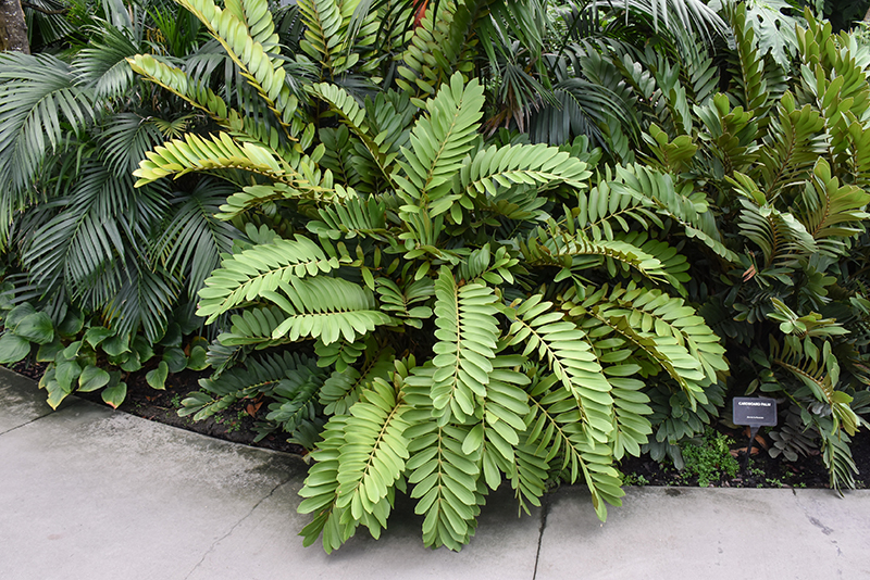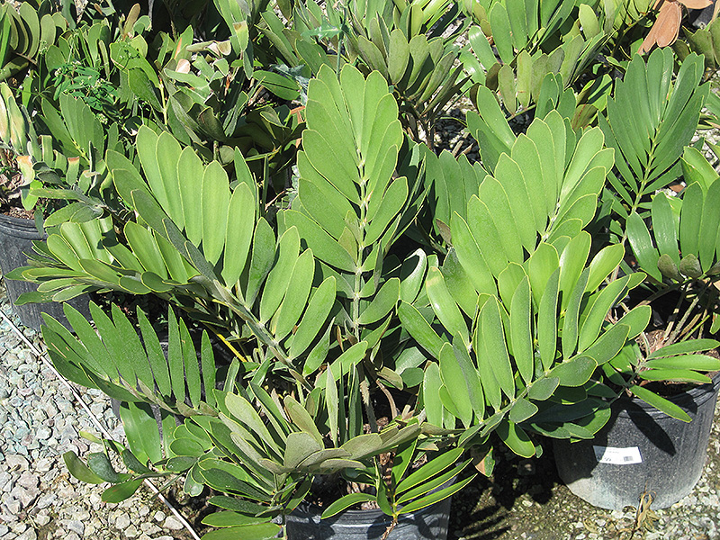 A vigorous cycad with a woody stem that is typically underground, unless on a shallow, rocky site; deep green, arching pinnate leaves are graceful in form and texture; female may produce rusty brown cones with crimson red seeds