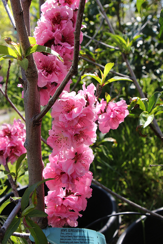 Donut Peach is smothered in stunning clusters of fragrant shell pink flowers along the branches in early spring, which emerge from distinctive pink flower buds before the leaves. It has dark green deciduous foliage. The narrow leaves turn yellow in fall. The fruits are showy gold drupes with a crimson blush, which are carried in abundance from early to mid summer. The fruit can be messy if allowed to drop on the lawn or walkways, and may require occasional clean-up.