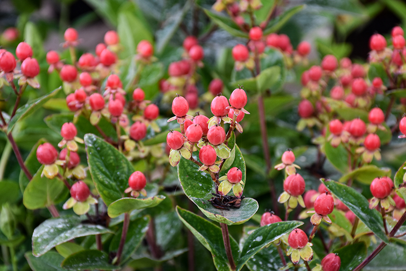 Miracle® Grandeur St. John's Wort has masses of beautiful yellow buttercup flowers at the ends of the branches from late spring to early summer, which are most effective when planted in groupings. The flowers are excellent for cutting. It features an abundance of magnificent cherry red berries from late summer to mid fall. It has dark green deciduous foliage. The pointy leaves do not develop any appreciable fall color. The brick red stems can be quite attractive.
