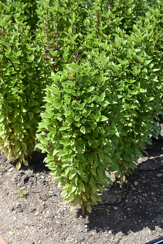 Well branched, compact and tidy, this variety flowers weeks later than the standard basil; perfect for small gardens or patio containers; green leaves with purple blushes are aromatic and vibrant with licorice flavor that compliments any dish