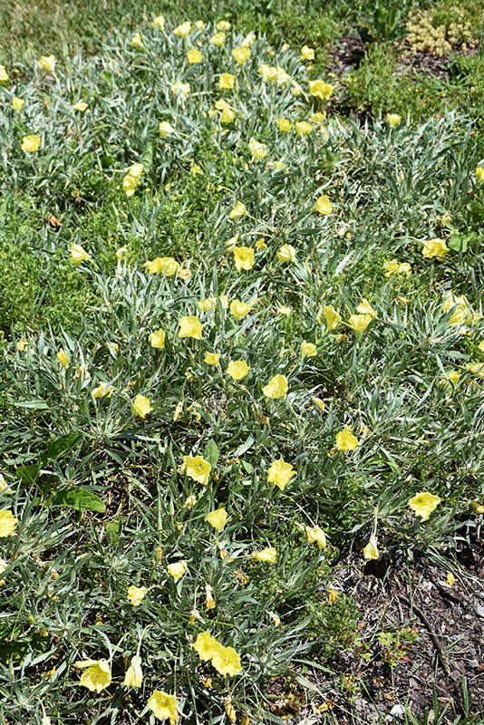Evening Sun Primrose will grow to be only 3 inches tall at maturity extending to 6 inches tall with the flowers, with a spread of 18 inches. When grown in masses or used as a bedding plant, individual plants should be spaced approximately 15 inches apart. Its foliage tends to remain low and dense right to the ground. It grows at a medium rate, and under ideal conditions can be expected to live for approximately 10 years. As an herbaceous perennial, this plant will usually die back to the crown each winter, and will regrow from the base each spring. Be careful not to disturb the crown in late winter when it may not be readily seen!