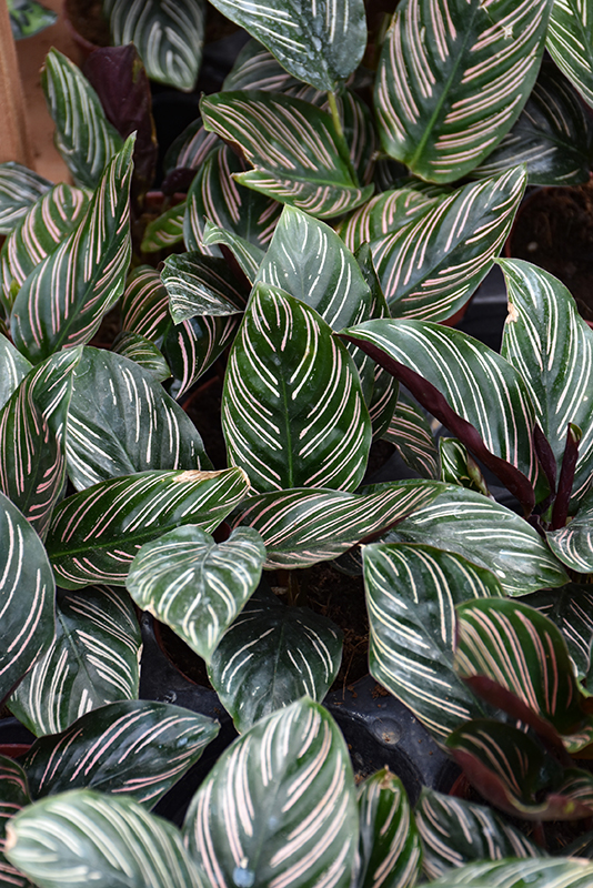 Pinstripe Calathea's attractive glossy oval leaves remain dark green in color with prominent pink stripes throughout the year on a plant with an upright spreading habit of growth.