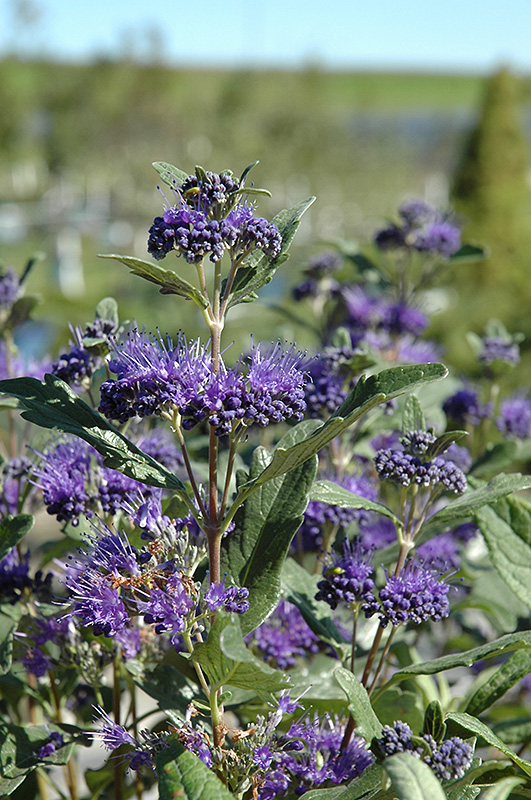Dark Knight Caryopteris makes a fine choice for the outdoor landscape, but it is also well-suited for use in outdoor pots and containers. With its upright habit of growth, it is best suited for use as a 'thriller' in the 'spiller-thriller-filler' container combination; plant it near the center of the pot, surrounded by smaller plants and those that spill over the edges. It is even sizeable enough that it can be grown alone in a suitable container. Note that when grown in a container, it may not perform exactly as indicated on the tag - this is to be expected. Also note that when growing plants in outdoor containers and baskets, they may require more frequent waterings than they would in the yard or garden.