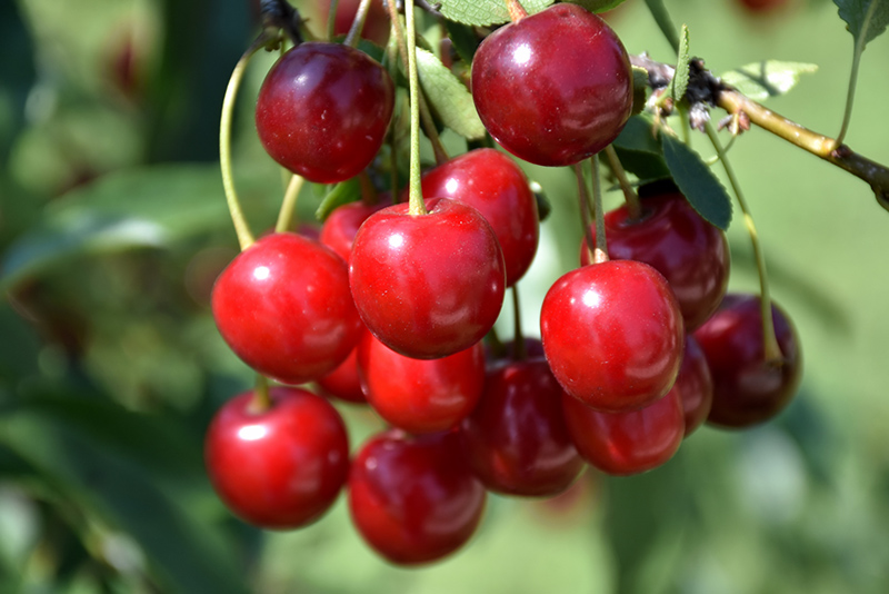 Juliet Cherry features showy clusters of fragrant white flowers along the branches in mid spring. It has green deciduous foliage. The glossy oval leaves turn yellow in fall. The fruits are showy dark red drupes carried in abundance from mid to late summer.