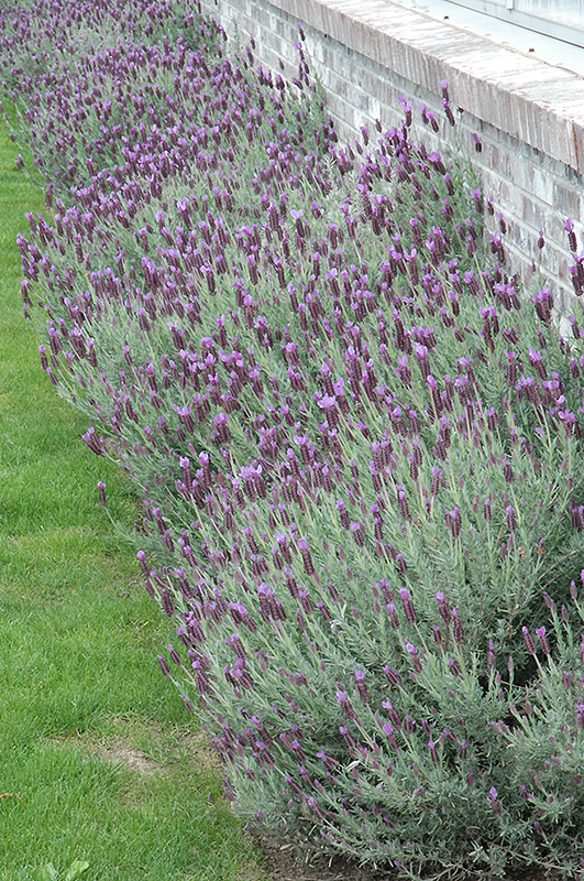 Otto Quast Spanish Lavender will grow to be about 24 inches tall at maturity extending to 3 feet tall with the flowers, with a spread of 24 inches. It tends to fill out right to the ground and therefore doesn't necessarily require facer plants in front. It grows at a slow rate, and under ideal conditions can be expected to live for approximately 10 years.